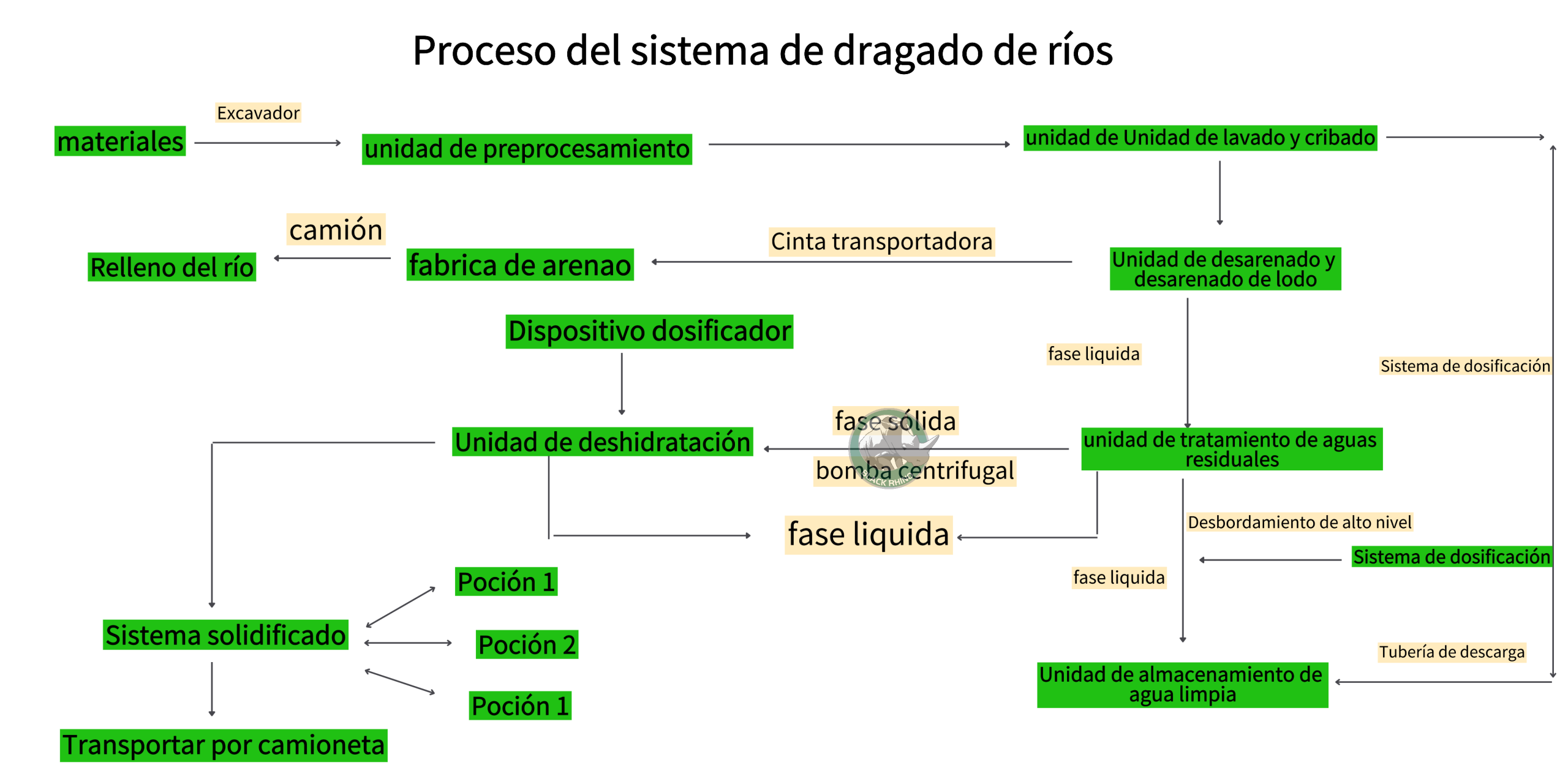 La tecnología de tratamiento de sedimentos del río Black Rhino comprende ocho módulos: pretratamiento, desarenado, eliminación de lodos, deshidratación, tratamiento de aguas residuales, almacenamiento de agua limpia, solidificación y tratamiento químico. Tras el pretratamiento, el material pasa a un proceso de lavado y cribado. La fase sólido-líquida pasa al proceso de desarenado y desarenado de lodos, donde la arena y la grava extraídas se almacenan en un área de acopio. La fase sólido-líquida pasa a la siguiente etapa de sedimentación rápida. Finalmente, según las diferentes características del material, la fase líquida ingresa a la unidad de tratamiento de aguas residuales para su posterior tratamiento antes de ingresar a la unidad de almacenamiento de agua circulante. El lodo de fondo pasa al proceso de deshidratación, reducción de volumen, inocuidad y estabilización. Finalmente, una vez que el efluente cumple con los estándares, se descarga o se transporta a una planta de tratamiento de aguas residuales. Una vez que esté cumple con los estándares, se devuelve al río. Tras un tratamiento inocuo, el sedimento del fondo deshidratado se transporta a un lugar designado para su vertedero o para su aprovechamiento.